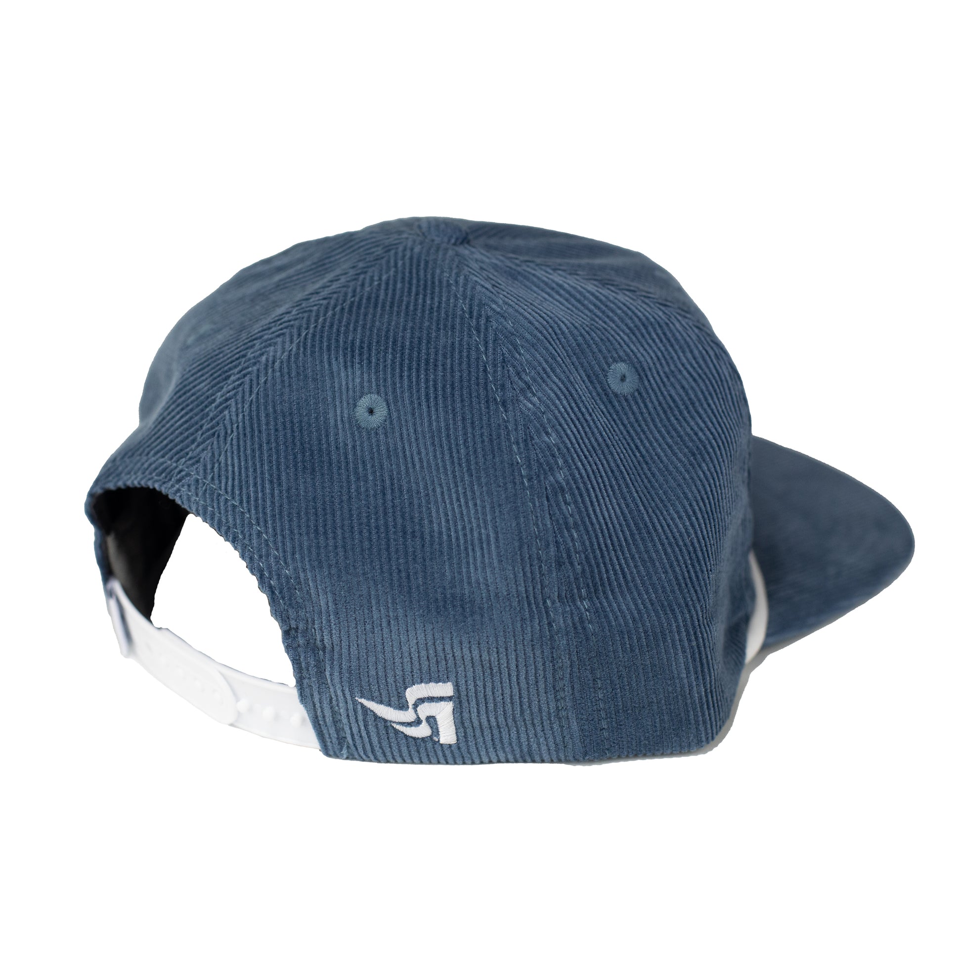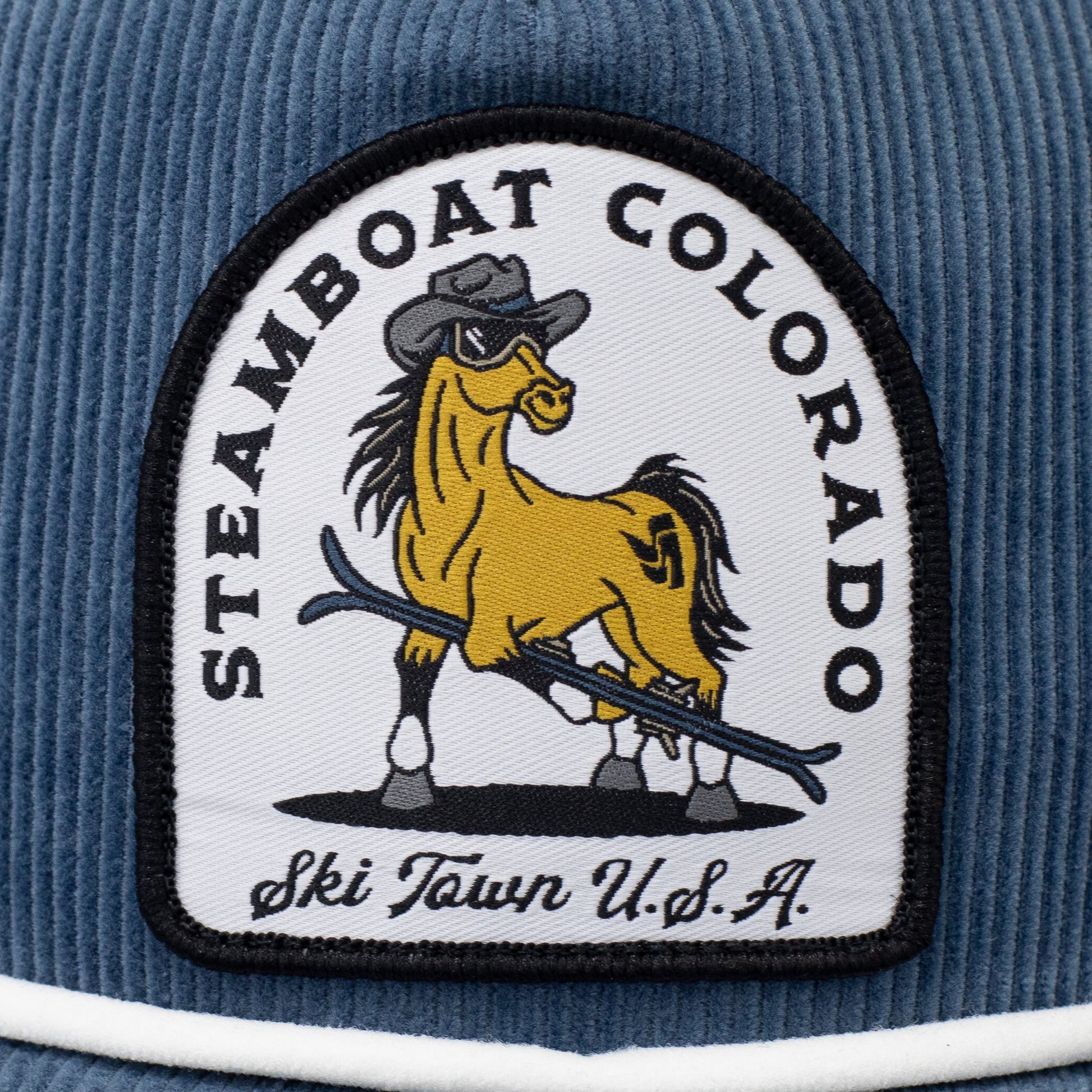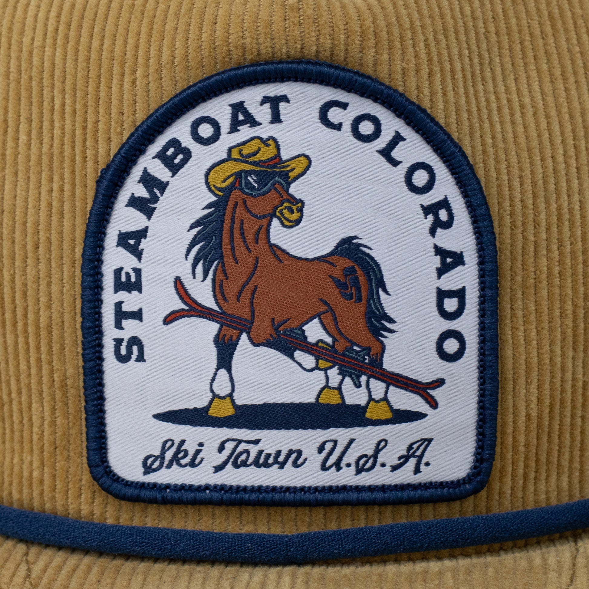 Corduroy cap featuring a horse skier patch with a black braided rope accent.