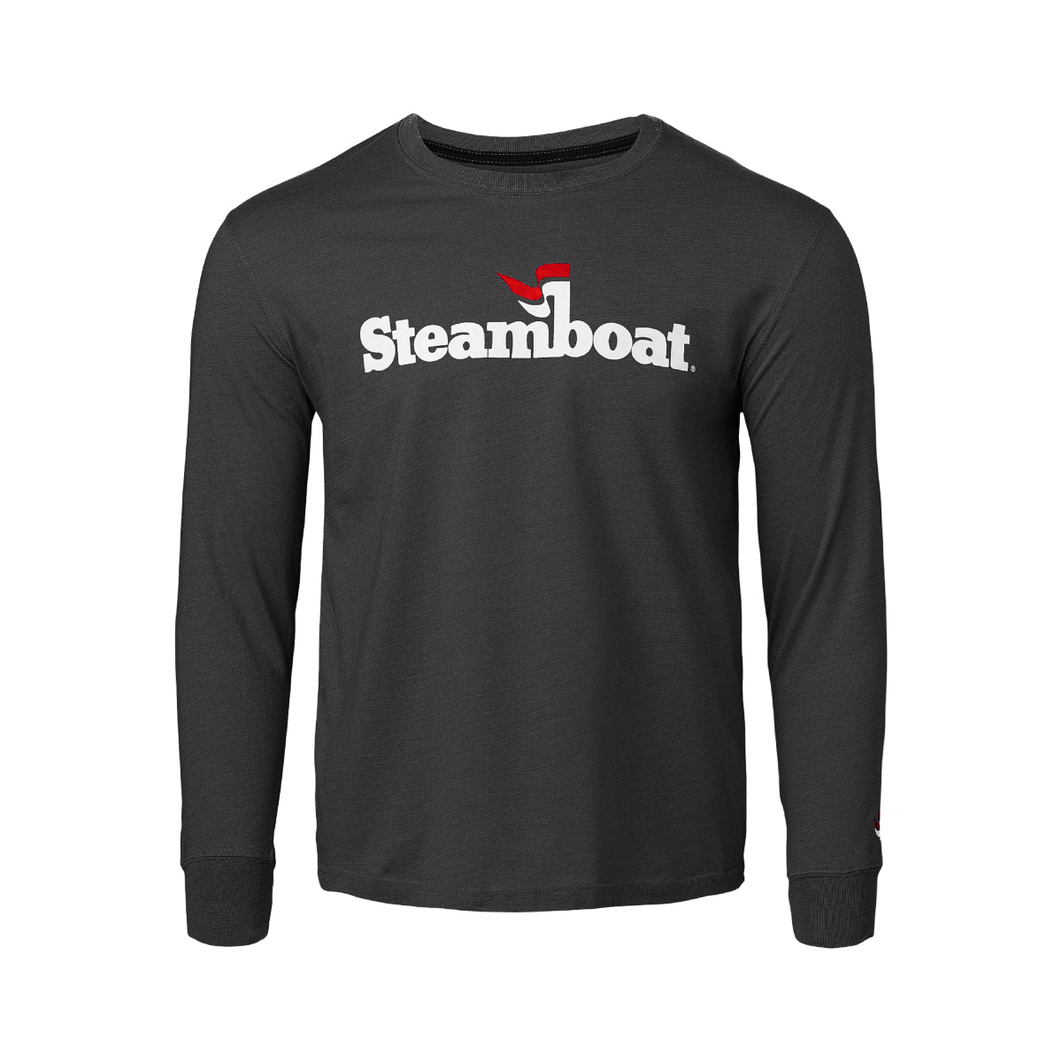 The official Steamboat long sleeve adult t-shirt with the Steamboat flag logo displayed across the chest with the Steamboat flag emblem on the left wrist.